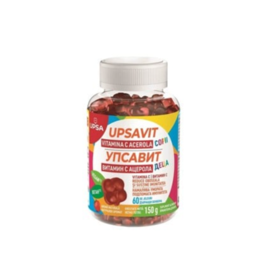 Упсавит витамин С с ацерола е продукт, подходящ за деца, базиран на плодове ацерола, обогатени с витамин С. Съдейства за намаляване на умората и укрепва нормалните функции на имунната система. Подходящ да компенсира недостига на витамин Ц. Дъвчащите бонбони могат да се приемат от деца над 7 години и от възрастни. Веган формула, не съдържа консерванти. С натурален аромат и вкус на ягода.