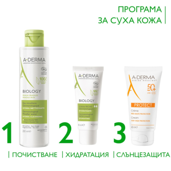 А-ДЕРМА БИОЛОДЖИ РУТИНА ЗА СУХА КОЖА - МИЦЕЛАРНА ВОДА 200МЛ + БОГАТ КРЕМ 40МЛ + СЛЪНЦЕЗАЩИТЕН КРЕМ ЗА СУХА КОЖА SPF50+ 40МЛ
