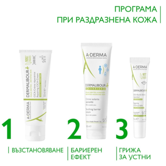 А-ДЕРМА ДЕРМАЛИБУР РУТИНА ПРИ РАЗДРАЗНЕНА КОЖА - ВЪЗСТАНОВЯВАЩ КРЕМ 50МЛ + ИЗОЛИРАЩ КРЕМ 100МЛ + БАЛСАМ ЗА УСТНИ 15МЛ