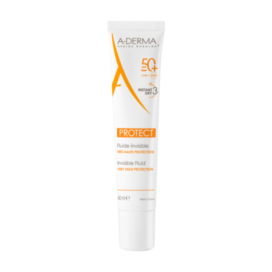 Този невидим слънцезащитен флуид за лице защитава уязвимата смесена към мазна кожа от UVA и UVB лъчите, синята и инфрачервената светлина. Дуото супер-абсорбиращи пудри, включено във формулата, мигновено абсорбира себума, намиращ се на повърхността на кожата. Технологията „Мигновено попиване за 3 секунди“, която не оставя бели следи или мазен филм върху кожата. A-Derma PROTECT НЕВИДИМ ФЛУИД SPF50+, водоустойчив слънцезащитен флуид, подсилва и съхранява уязвимата кожа от уврежданията, причинени от слънцето, благодарение на Barriestolide®, извлечен от масло от Кълнове от Овес Rhealba®. Патентована* иновация, резултат от седемгодишни изследвания. Благодарение на внимателния подбор и оптимизираната концентрация на биоразградими филтри и съставки, A-Derma PROTECT НЕВИДИМ ФЛУИД SPF50+ е най-добрият отговор на нуждата от ежедневна слънцезащита.