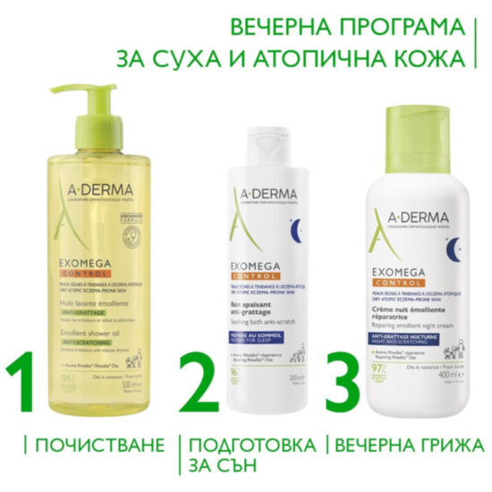 А-ДЕРМА ЕКЗОМЕГА КОНТРОЛ ВЕЧЕРНА РУТИНА ЗА СУХА И АТОПИЧНА КОЖА - ДУШ ОЛИО 500МЛ + УСПОКОЯВАЩА ВАНА 200МЛ + ВЪЗСТАНОВЯВАЩ НОЩЕН КРЕМ 400МЛ/A-DERMA EXOMEGA CONTROL NIGHT ROUTINE FOR DRY AND ATOPIC SKIN - SHOWER OIL + SOOTHING BATH + NIGHT CREAM
