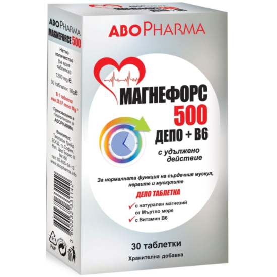 МАГНЕФОРС 500 мг ДЕПО + B6 таблети с удължено действие е специална комбинация от магнезиеви соли, съдържаща органичен магнезиев оксид, добит от Мъртво море и магнезиев цитрат. Формулата на МАГНЕФОРС 500 мг ДЕПО + B6 таблети с удължено действие позволява бързото освобождаване след прием на магнезиевия цитрат, които се абсорбира бързо и осигурява оптимална бионаличност, докато магнезиевият оксид се усвоява на части от организма и позволява продължителното подаване на магнезиеви йони в организма през целия ден. Добавеният витамин B6 подпомага усвояването на магнезия в организма.