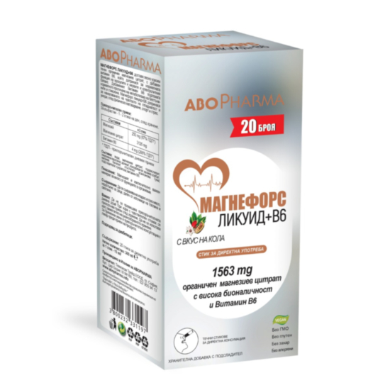 МАГНЕФОРС ЛИКУИД+B6 1563 mg е комбинация от органичен магнезиeв цитрат с висока бионаличност и Витамин В6, в стик за директна употреба, с вкус на кола.