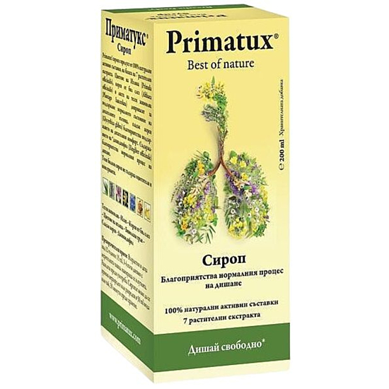 Сиропът на Abo Pharma Primatux е билков продукт от 100% натурални съставки, на базата на 7 растителни екстракта. Цветове на иглика (Primula officinalis), корен от бял слез (Althaea officinalis) и листа на тесен живовляк (Plantago lanceolata) допринасят за поддържане нормалното състояние на дихателните пътища, сладък корен (Glycyrrhiza glabra) благоприятства поддържането на дихателния комфорт. Съдържанието на джинджифил (Zingiber officinale) благоприятства нормалния процес на дишане. Този билков сироп не съдържа оцветители и консерванти.