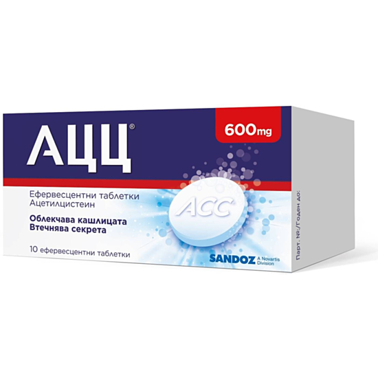 АЦЦ 600 ЕФФ. ТАБЛ. Х 10 - АЦЦ® 600 mg ефервесцентни таблетки представляват лесно за приемане лекарство против кашлица, като е необходима само една таблетка дневно. АЦЦ® е муколитик и избор № 1 за лекарство против кашлица на пациентите в Европа и България. С уникалното си тройно действие спомага за втечняване на храчките, улеснява отхрачването и защитава белите дробове от оксидативен стрес посредством активното вещество ацетилцистеин.