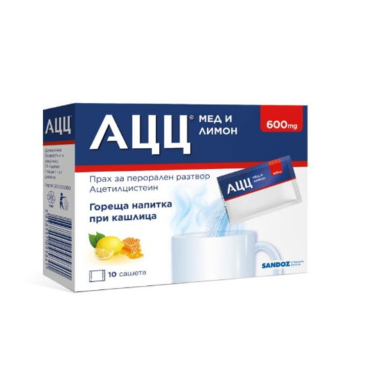 АЦЦ 600 ПРАХЧЕТА 600МГ. Х 10 - АЦЦ® Мед и Лимон 600 mg прах за перорален разтвор представлява лесно за приемане лекарство против кашлица, като е необходим само един прием дневно. АЦЦ Мед и Лимон 600 mg прах за перорален разтвор, приготвен като гореща напитка, има вкус на мед и лимон. АЦЦ® е муколитик и избор № 1 за лекарство против кашлица на пациентите в Европа и България. С уникалното си тройно действие спомага за втечняване на храчките, улеснява отхрачването и защитава белите дробове от оксидативен стрес посредством активното вещество ацетилцистеин.