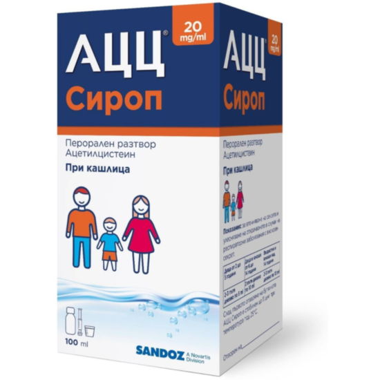 АЦЦ ЗА ДЕЦА СОЛ ПЕРОРАЛЕН Р-Р 100МЛ - АЦЦ® Сироп се използва за втечняване на гъстата слуз и за облекчаване на кашлицата при заболявания на дихателната система, свързани с образуване на гъста слуз, при възрастни и деца над 2-годишна възраст. Съдържа активното вещество ацетилцистеин, което също така има и антиоксидантен ефект. С възможността за индивидуално определяне на дозата за всеки член на семейството това лекарство помага да се справите с кашлицата.