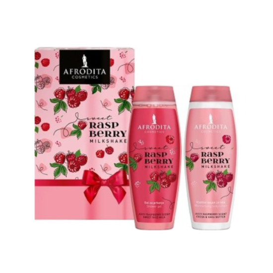 Зарадвайте себе си или любима жена с подаръчния комплект Sweet Raspberry Milkshake от Afrodita Cosmetics. Той съдържа душ гел и лосион за тяло. Те притежават сладък малинов аромат, който ще завладее всичките ви сетива. Поднесени са в красива картонена кутия, готова за подарък.