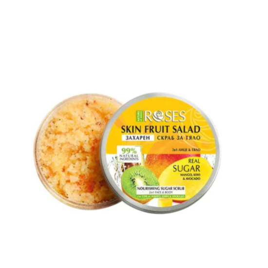 АГИВА FRUIT SALAD СКРАБ ЗА ТЯЛО МАНГО 200МЛ e нежен подхранващ скраб за лице и тяло, който съдържа истинска захар, натурални ексфолиращи частици и сок от плодове. Той деликатно ексфолира кожата и ефикасно премахва мъртвите клетки. Обогатен е със 100% свежи плодови сокове и натурални масла за копринено гладка и мека кожа. Подходящ е едновременно за ежедневно измиване и за дълбока ексфолация на кожата, както за лице, така и за тяло.