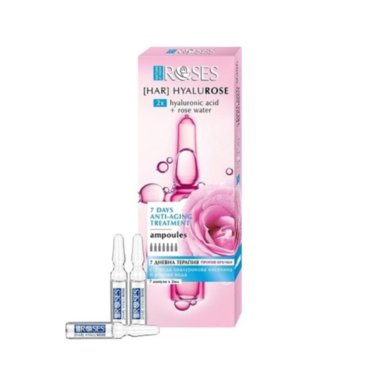 АГИВА РОЗЕС 7 ДНЕВНА ТЕРАПИЯ ПРОТИВ БРЪЧКИ 7Х2МЛ - Ампулите за лице съдържат 2 вида хиалуронова киселина и розова вода, които ефективно допринасят в борбата с бръчките. Нискомолекулният хиалурон задържа влагата в повърхностния слой на клетките. В комбинация с натуралния пептид и розова вода, ампулите интензивно хидратират кожата на лицето, като допринасят за нейната плътност и еластичност.