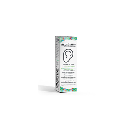Акустивум Спрей за уши размеква ушната кал образувана във външния слухов проход, леко овлажнява ушния канал, като по този начин улеснява отстраняването на ушната кал и на образуваните тапи ушна кал. Осигурява поддържане на подходяща хигиена на ушите и защитава ушите от инфекция, подхранва кожата на външния слухов проход. Използван профилактично, Acustivum предотвратява възникването на тапи ушна кал, като поддържа естествения процес на самопочистване на ухото от ушната кал. Спреят покрива с фин слой повърхността на външния слухов проход като създава защитна бариера, предпазваща от навлизане и задържане на вода във вътрешността на ухото при къпане или воден спорт. Слънчогледовото масло, маслата от сладък бадем, маслина и жожоба, съдържащи се в състава, подхранват често изсушената или раздразнена кожа на външния слухов проход.