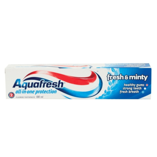 АКВАФРЕШ ПАСТА ЗА ЗЪБИ ТРОЙНА ЗАЩИТА FRESH&MINTY СИНЯ 100МЛ 2811005 е свежа семейна паста за зъби с тройна защита, съдържаща флуорид, която предпазва от появата на кариеси, като елиминира захарните киселини и плаката. Съдържащите се активни минерали в Аквафреш Тройна защита се абсорбират в зъбите, като спомагат за тяхното подсилване и ги укрепват отвътре навън. AquaFresh Triple Protection Fresh & Minty създава защитен щит, който помага да се блокира атаката на захарната киселина през целия ден. С изключително свеж ментов аромат.