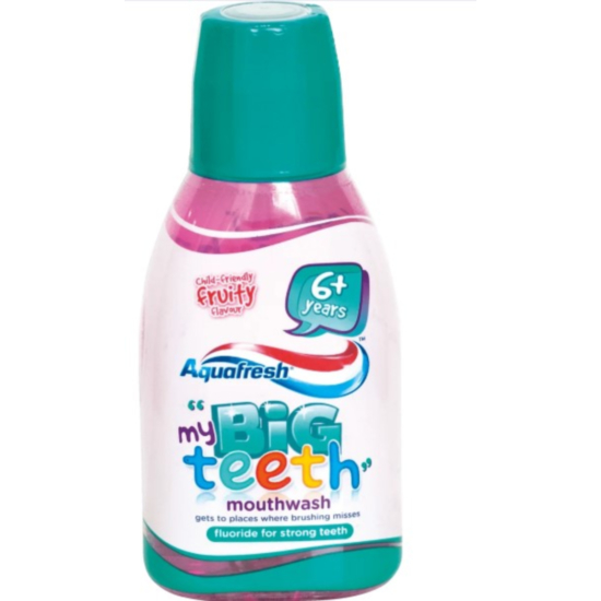АКВАФРЕШ ВОДА ЗА УСТА ДЕТСКА 6+ С ПЛОДОВ ВКУС 300МЛ 2804006 e специална вода за уста със приятен плодов вкус, подходяща за деца над 6 години, съдържаща флуорид, който заздравява емайла и защитава новите постоянни зъбки от киселините и захарите в продължение на 24 часа. AquaFresh My Big Teeth Вода за уста е специално разработена от дентални специалисти, предоставяща нежна грижа, която помага на зъбките да бъдат силни и здрави и спомaга за почистване на по-трудно достъпните места.