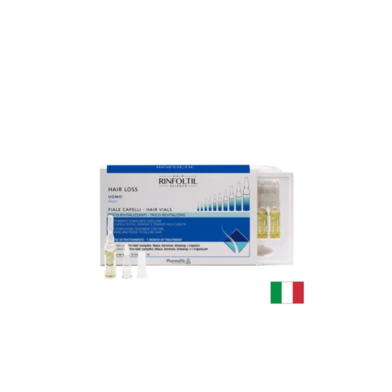 Ринфолтил Ампули е козметичен продукт на италианската компания Pharmalife Research, разработен специално за мъже, страдащи от интензивен косопад, изтъняване на косата и признаци на андрогенна алопеция. Формулиран с активни вещества от растителен произход, разтворът въздейства целенасочено върху космените фоликули, като подпомага физиологичния цикъл на растеж и спомага за възстановяване на здравината и плътността на косата.