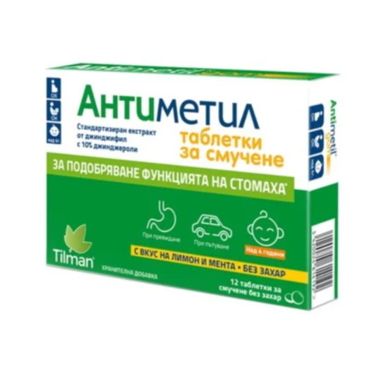 Antimetil на Тилман е продукт, който благоприятства нормалната работа на стомаха. Съдържа стандартизиран екстракт от джинджифил с 10% джинджероли, който подобрява храносмилателните процеси. Подходящ е за прием от възрастни и деца над 4 години при състояния на преяждане, гадене и повръщане, както и по време на пътуване. Облекчава стомашния дискомфорт и подобрява състоянието. Със свеж вкус на мента и лимон, без захар. Предлага се в опаковка от 12 таблетки за смучене.