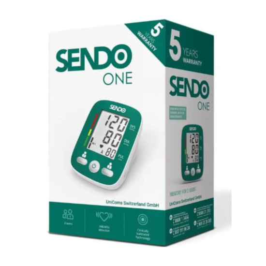 SENDO One е новото попълнение в автоматичните дигитални апарати за кръвно налягане SENDO. Измерва с клинична точност в домашни условия и разполага с памет за двама души, съхранявайки до 90 измервания на човек. Използва се лесно, върху бицепса на ръката и с натискане на един бутон. Паметта за двама души е отличителната черта на SENDO One, което го прави много подходящ за семейна двойка, която иска да следи показателите на кръвното си налягане с помощта на един апарат. Сендо Уан е клинично одобрен от EHS European Society of Hypertension (Европейско дружество по хипертония) и използва класификацията за кръвно налягане на Световната Здравна Организация (СЗО). Позволява лесно проследяване на аритмията във времето. Работи с батерии или включен в електрическата мрежа чрез адаптер. Апаратът пристига с 4 батерии AAA.