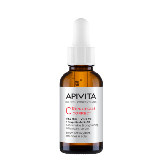 C15 Propolis Correct серум разкрива мощната противостарееща синергична комбинация на Vitamin C, Vitamin E и Патентован Propolis AoX-CR. Съдържащ 15% чист стабилизиран Vitamin C и 1% чист Vitamin E, той неутрализира вредите, причинени от стресовите фактори на околната среда и свободните радикали. Силната антиоксидантна ефикасност на тези две най-добри, утвърдени дерматологични съставки е допълнително подсилена с ексклузивния за APIVITA Патентован Propolis AoX-CR. Неговата несравнима ефикасност доказано удвоява антиоксидантната ефикасност на Vitamin C + E, като по този начин значимо подсилва коригиращата стареенето сила на тази мощна синергична комбинация.