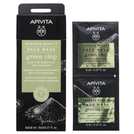АПИВИТА МАСКА ЗА ЛИЦЕ СЪС ЗЕЛЕНА ГЛИНА 2Х8 МЛ - Дълбоко почистващата маска със зелена глина на Апивита премахва черните точки и замърсяванията и почиства порите в дълбочина. Тя успокоява, подмладява и предава на кожата мекота и свежест. Подходяща е за комбинирана и мазна кожа. Маската е от линията Express Beauty, която е вдъхновена от средиземноморската диета и нейното богато разнообразие от плодове и зеленчуци, които ни дават ценни вещества, доставящи балансирана храна и здраве на нашата кожа. Водата във формулата е заменена с антиоксидантна инфузия от гръцки планински чай с антиоксидантно действие. Дерматологично тестван продукт. Не съдържа парабени, силикони, пропилен гликол, етаноломини, фталати, минерални масла, РСМ, NM.