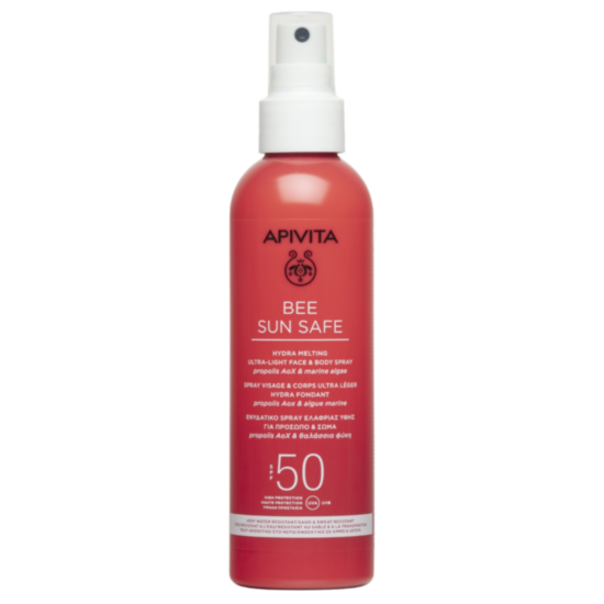 АПИВИТА СЪН ХИДРАТИРАЩ СПРЕЙ С УЛТРА ЛЕКА ТЕКСТУРА ЗА ЛИЦЕ И ТЯЛО SPF50 200МЛ. -  Tози слънцезащитен спрей лосион за лице и тяло придава мигновено усещане на свежест и хидратация. Попива за секунди, благодарение на своята ултра лека текстура. Идеален е за дейности на открито през лятото, с изключителна текстура, устойчива на вода, пясък и изпотяване. Ароматът е свеж и летен и повдига настроението.