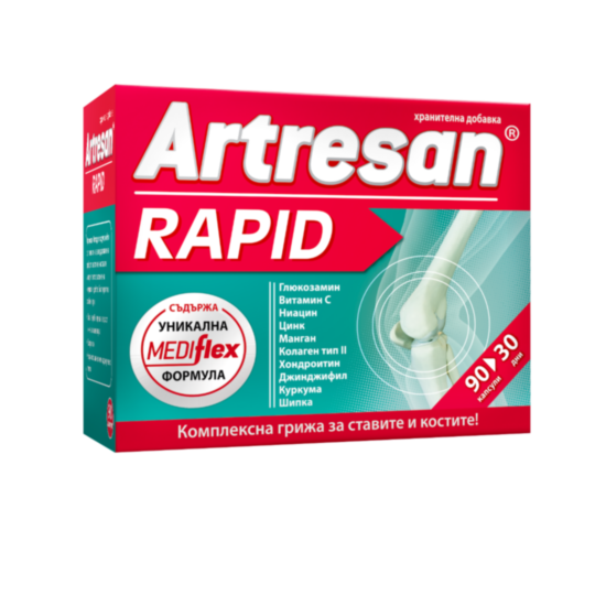 Артресан рапид е хранителна добавка с изключително богат състав, който комбинира традиционно използваните съставки като глюкозамин, витамини и минерали с иновативната MEDIFLEX формула, която представлява уникално съчетание на специално дозирани количества колаген тип II, хондроитин, джинджифил, куркума и шипка. Съдържа максимална доза глюкозамин – 1500 mg дневно.*