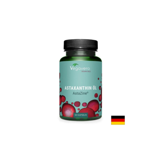 Astaxantin Astazine на немската компания Vegavero е 100% веган продукт, който не съдържа изкуствени добавки и ГМО. Произведен е според световни стандарти: ISO 9001, HACCP, GMP. Суперикономичната опаковката е достатъчна за 3-месечен прием.