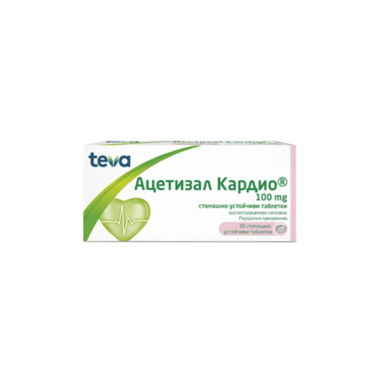 Ацетизал Кардио на фармацевтичната компания Тева се препоръчва за предотвратяване образуването на кръвни съсиреци (тромби) след някои видови сърдечни хирургични интевенции, с цел да се разширят или деблокират кръвоносните съдове. Ацетизал Кардио се използва, за да намали риска от образуване на кръвни съсиреци и да предотврати инсулти, сърдечни пристъпи и сърдечно-съдови проблеми при пациенти, които страдат от стабилна или нестабилна стенокардия (вид болка в областта на гръдния кош). Acetysal Cardio съдържа ацетилсалицилова киселина, която в ниски дози спада към група лекарства наричани антитромбицитни средства. Тромбоцитите са малки кръвни клетки, които причиняват съсирване на кръвта и участват в тромбозата. Когато в една артерия се образува кръвен съсирек, той пречи на кръвотока и прекъсва снабдяването с кислород. Когато това се случи в сърцето, може да причини сърдечен пристъп или ангина пекторис, в мозъка този тромб може да причини инсулт. Този лекарствен продукт не се препоръчва при спешни случаи. Той може да се използва само като профилактично лечение. Предлага се в опаковка от 30 таблетки.