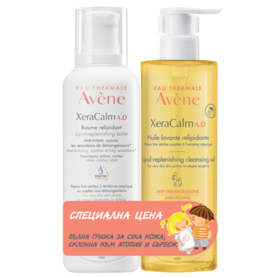 Авен предлага комплект XeraCalm A.D. Релипидиращ балсам за суха и атопична кожа 400мл + XeraCalm A.D. Релипидиращо почистващо олио за суха и атопична кожа 400мл
