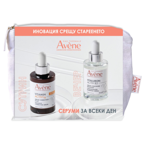 Комплектът на Avène включва 2 страхотни продукта, които ще се погрижат за красотата и здравето на кожата на лицето - серум-концентрат с изпълващо действие Hyaluron Activ B3 и озаряващ коригиращ серум Vitamin Activ Cg.