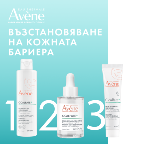 АВЕН ЦИКАЛФАТ+ ИНТЕНЗИВНО ВЪЗСТАНОВЯВАЩ СЕРУМ 30МЛ е иновативен продукт, предназначен за възстановяване на отслабената кожна бариера и укрепване на кожата. Съдържа висока концентрация на термална вода Avène, провитамин В5 и TRP-Regulin™, които действат в синергия, за да възстановят и укрепят кожата ден след ден. Авен Цикалфат+ Възстановяващ защитен серум предоставя незабавно и дълготрайно облекчение на опъването и дискомфорта, с -84% по-малко дразнене на кожата за 1 седмица. Непосредствено след нанасяне, зачервяването, сухотата и дискомфортът намаляват. Кожата е хидратирана за 24 часа и става по-еластична, успокоена и гладка след 3 седмици употреба. Формулата на продукта е без алкохол, аромати и силикон, като осигурява висока толерантност. Съдържа 96% естествени съставки и е подходящ за всички типове кожа. Текстурата на серума е свежа млечна гел, която осигурява кадифено покритие и възстановява комфорта на кожата.
