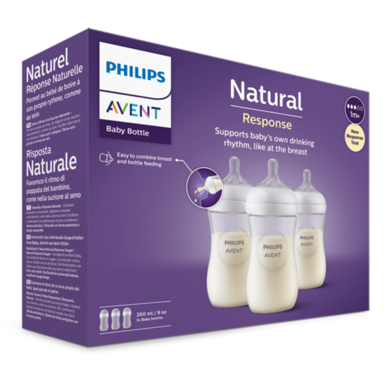Биберонът без протичане Natural Response има уникален J-образен отвор, който пропуска мляко само когато бебето засуква активно и спира потока на мляко, когато бебчето спре да пие. Това позволява на мъничето да преглъща и да си поема удобно въздух, когато не пие, също както при кърмене.