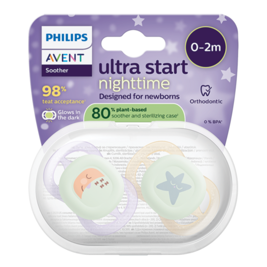 Спокойствие още от самото начало. Philips Avent - Ultra Start Night е създадена, за да пасне на устата на новородените и може безопасно да се използва и до 6 месеца. Свети в тъмното, така че лесно можете да я откриете. Сега 80% на растителна основа. Светещата капачка улеснява намирането на залъгалките на тъмно, а включеният калъф служи не само като практичен контейнер, но и като удобен стерилизатор;