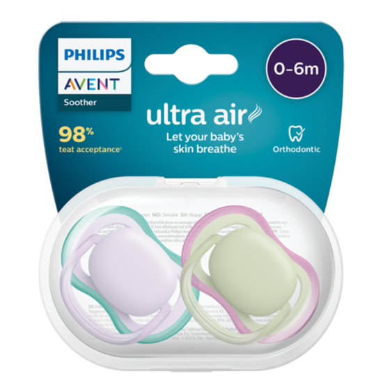 Philips Avent Ultra AIR Ортодонтична залъгалка мечти 0-6М 2 бр подходяща за бебета от 0 до 6 месеца. Разполага с деликатен предпазител, който не оставя следи и не дразни кожата и има дизайн, който следва естествените извивки на лицето на бебето. Залъгалката е създадена специално, за да съдейства за естествено орално развите на зъбите, венците и небцето. Биберонът е изработен от мек силикон със симетрична форма и копринена текстура.Силиконовия биберон е предназначен да имитира усещането за гърдите на майките.Залъгалките на Авент са изработени от висококачествени материали, напълно безопасни за здравето на вашето бебе.