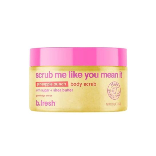 B.Fresh Pineapple Punch Скраб за тяло е обогатен с масло от ший. С неустоим аромат на сочен ананас. Ефективно почиства кожата в дълбочина, отстранява замърсяванията и мъртвите клетки. Маслото от ший подхранва кожата в дълбочина. Подобрява нейната мекота и еластичност. С натурален аромат. Не съдържа парабени, алкохол и алуминиеви соли. Веган.