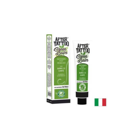 Aftertattoo Green Balm съчетава успокояващото и възстановяващо действие на пантенол, екстракт от невен, витамин Е и бизаболол, подхранващото действие на маслото от ший и кокосовото масло с антиейдж действието на зехтин, органично слънчогледово масло и масло от пшеничен зародиш. Комбинирането на маслата позволява поддържането на лек защитен филм върху външната повърхност на епидермиса. В допълнение те подхранват и хидратират кожата, предотвратявайки изпарението. Насърчават рехидратацията и възстановяването на липидите, като по този начин противодействат на сухотата и стареенето на кожата.