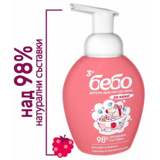 БЕБО ДЕТСКИ ДУШ ГЕЛ НА ПЯНА НАТУРАЛЕН МАЛИНА 300МЛ - Душ гелът от Бебо е специално разработен за заздравяване и нежна грижа за кожата след третата годинка. Пяната прави къпането истинско забавление. С помпата продуктът се дозира лесно, а консистенцията му помага лесното нанасяне по тялото. Така детето придобива самочувствие, че може да се справи само с ежедневната си хигиена. Безсулфатна формула, с комплекс от слънчогледово масло, който омекотява и хидратира кожата.
