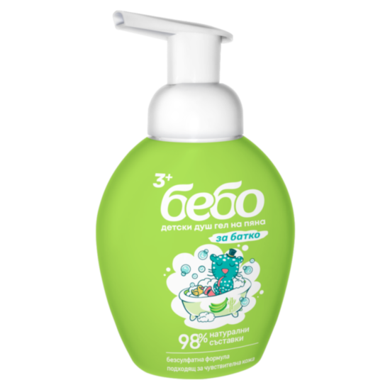 БЕБО ДЕТСКИ ДУШ ГЕЛ НА ПЯНА НАТУРАЛЕН ЗЕЛЕН БАНАН И БАМБУК 300МЛ е предназначен за ежедневна хигиена за деца след третата годинка. Децата се забавляват истински от пяната. Благодарение на помпата, продуктът се дозира лесно. Той е с лека текстура, което позволява лесното нанасяне по тялото. Формулата му е безсулфатна и съдържа комплекс от слънчогледово масло, който омекотява и хидратира кожата. Продуктът не изсушава и не прпедизвиква дискомфорт.