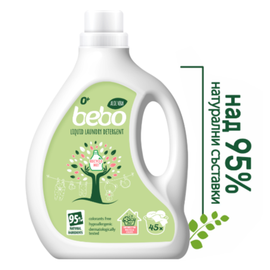 Течният перилен препарат bebo с аромат на алое вера съчетава ефективна грижа и нежност в една внимателно балансирана формула. С над 95% натурални съставки, той е създаден специално за чувствителна кожа и за хората, които търсят по-щадящ избор за природата. Хипоалергенен и дерматологично тестван, препаратът е подходящ още от първия ден на бебето.