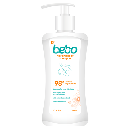 Шампоанът за коса и тяло от Бебо е с нова формула. Подходящ както за новородени и кърмачета, така и за деца и възрастни с чувствителна кожа и скалп. Нова формула за нежно почистване на бебешката и детска кожа и коса с усещане за богато обгрижване. Кремообразната пяна измива деликатно, запазвайки баланса на липидите и кожното рН. Специални иновативни съставки защитават от изсушаване и раздразнения, като възстановяват и поддържат кожната бариера. Предпазва скалпа от появата на крусти (млечни корички при бебетата) и улеснява разресването. Не дразни очите. 98% натурален продукт. За ежедневна употреба.