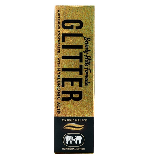 БЕВЪРЛИ ХИЛС ПАСТА ЗА ЗЪБИ ГЛИТЪР ГОЛД ЕНД БЛЕК РЕМИНАЛИЗИРАЩА 100МЛ е избелваща и реминализираща паста за зъби. За пълна защита на устната кухина. За силни и здрави зъби. Подсилено почистване, комбинирано с нежно и безопасно избелване на зъбите. С активен въглен, истинско злато, хиалуронова киселина и хидроксилапатит.