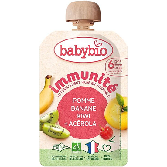 BABYBIO Immunite Бейби Био Плодов мус от Ябълка, Банан, Киви и Ацерола, предназначен за бебета над 6-месечна възраст. Естествен източник на витамин C. Произведен от внимателно подбрани органични съставки с естествена сладост от плодовете, без добавена захар, без мляко и глутен. Подходящ като десерт или лека закуска между храненията. В опаковка удобна за път и разходка.