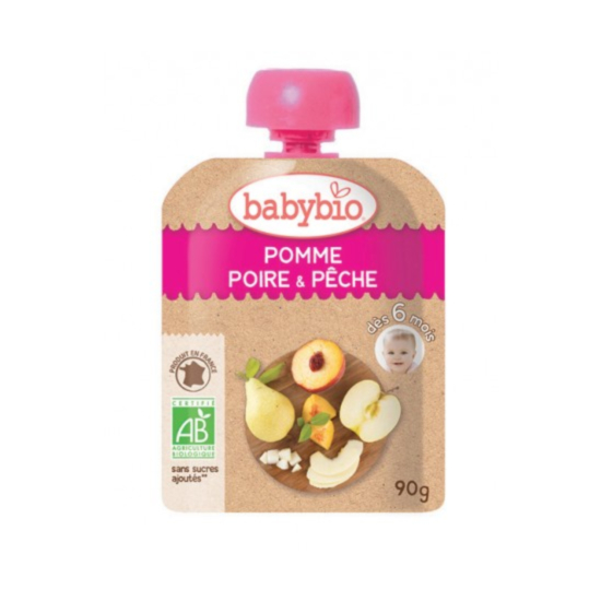 БЕЙБИ БИО ПЛОДОВ МУС С ЯБЪЛКА, ПРАСКОВА И КРУША 90ГР. 6М+