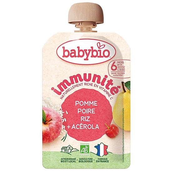 Био плодовият мус с ябълка, круша, ориз и ацерола на Babybio е чудесен вариант за бързо хапване. Подходящо е за деца над 6 месеца. Предлага се в удобна опаковка от 100 g, което е достатъчно за едно бързо хапване. Опаковката е много подходяща и за хапване навън, когато сте на разходка или път.