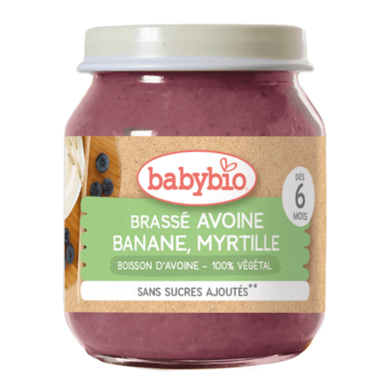 БЕЙБИ БИО ПЛОДОВО ПЮРЕ С ОВЕС, БАНАН И СИНЯ БОРОВИНКА 130ГР 6+ е био плодово пюре с овес, банан и дива синя боровинка, предназначено за бебета над 6-месечна възраст. Идеално за десерт, следобедно хранене или лека закуска между храненията. Пюретата на Babybio са направени с изцяло био продукти, без стабилизатори, оцветители и консерванти.