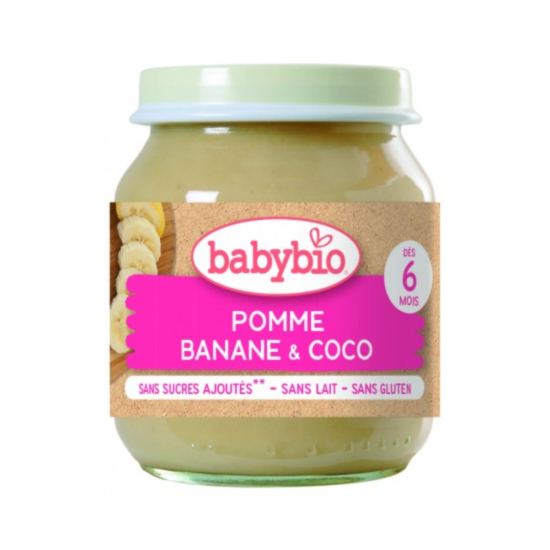 БЕЙБИ БИО ПЛОДОВО ПЮРЕ С ЯБЪЛКА, БАНАН И КОКОСОВО МЛЯКО 130ГР. 6М+