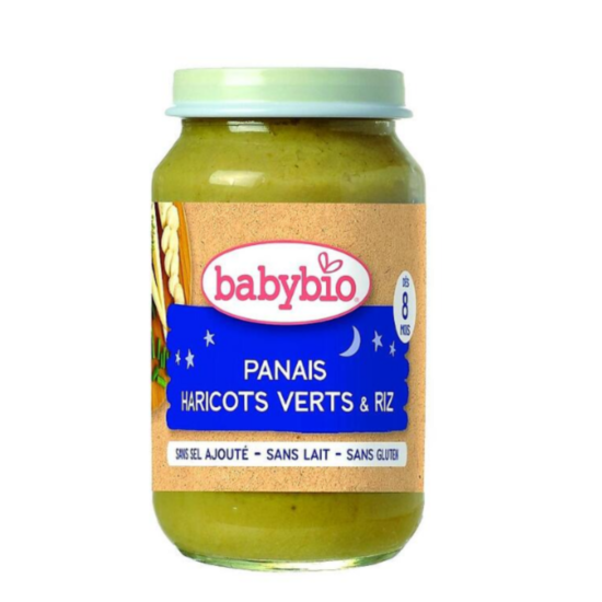 БЕЙБИ БИО ЗЕЛЕНЧУКОВО ПЮРЕ ПАЩЪРНАК, ЗЕЛЕН ФАСУЛ И ОРИЗ 200ГР 8+ е зеленчуково пюре с пащърнак, зелен фасул и ориз е био сертифицирана храна, предназначена за деца над 8 месечна възраст. Комбинация от изключително полезните зеленчуци и ориз, осигуряват оптимални количества витамини и минерали, необходими за правилния растеж на децата. Пюретата на Babybio са направени с изцяло био продукти, без стабилизатори, оцветители и консерванти.
