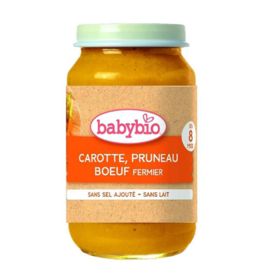 БЕЙБИ БИО ЗЕЛЕНЧУКОВО ПЮРЕ С МОРКОВ С.СЛИВИ И ГОВЕЖДО 200ГР 8+ е превъзходна солено сладка комбинация за деца над 8 месеца. За нормално развитие, децата трябва да имат разнообразно и пълноценно меню включващо богатите на витамини и минерали зеленчуци и плодове. Пюретата на Babybio са направени с изцяло био продукти, грижливо селектирани, без стабилизатори, оцветители и консерванти и приготвени на пара, за да може детето да се наслади на истинския вкус на храната.
