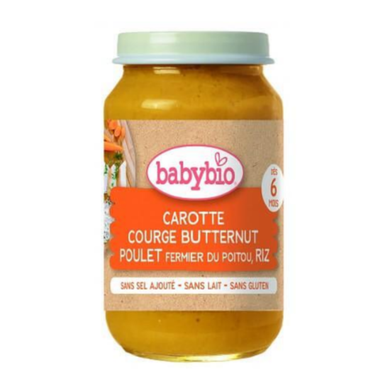 БЕЙБИ БИО ЗЕЛЕНЧУКОВО ПЮРЕ С ПИЛЕШКО МЕСО, ОРИЗ И ТИКВА 200ГР. 6М+ представлява превъзходна комбинация за деца над 6 месечна възраст. Пюретата на Babybio са направени от био продукти, без стабилизатори, оцветители и консерванти. Съчетанието от изключително полезни зеленчуци и пилешко месо, гарнирани с ароматни нотки мащерка, осигурява оптимални количества ценни хранителни вещества, необходими за правилния растеж на децата. Babybio Био зеленчуково пюре с пилешко месо, ориз и тиква има приятен вкус и засищаща консистенция, тя е идеален избор да предложите и запознаете Вашето дете с нови вкусове и текстури.