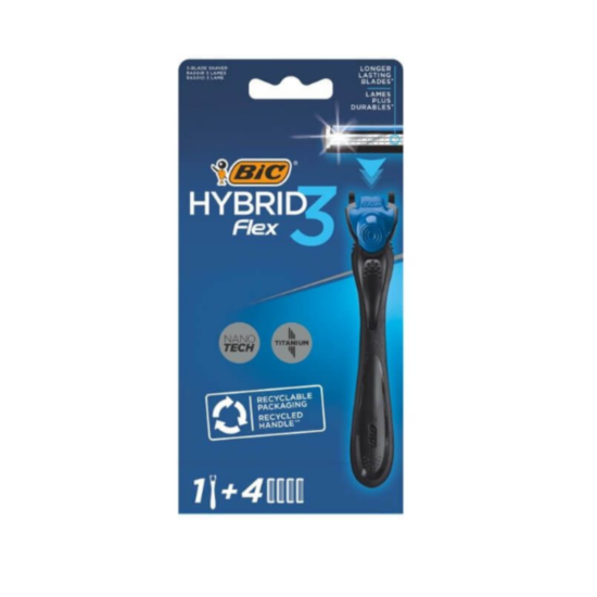 БИК СИСТЕМА САМОБРЪСНАЧКА ФЛЕКС 3 ХИБРИД + 4 НОЖЧЕТА - е висококачествена самобръсначка предназначена за мъже. Тя помага за лесно и безопасно бръснене без зачервявания и раздразнения. Рискът от порязване с нея е ограничен до минимум, като бръсненето е изключително гладко. На главите в комплекта са закрепени и лубрикиращи ленти с алое, които намаляват риска от порязване, спомагайки за безпроблемното приплъзване по кожата, като в същото време я успокояват.