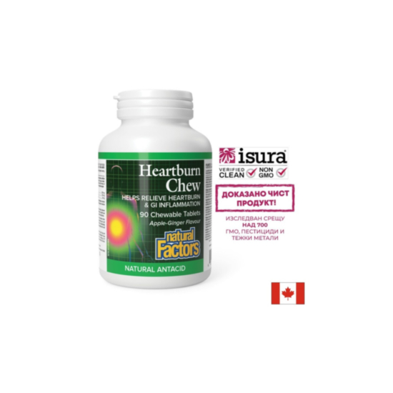 Heartburn на Natural Factors се предлага под формата на лесни за прием дъвчащи таблетки с приятен вкус на ябълка и джинджифил. Дъвченето подпомага смесването на активните съставки със слюнката, което улеснява тяхното действие в храносмилателния тракт.