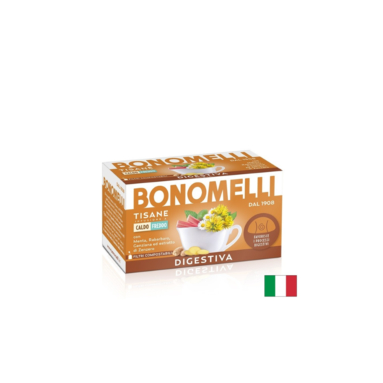 Tisane Digestiva на италианската компания Bonomelli е висококачествена билкова смес, която съдържа в състава си екстракт от мента, лайка, върбена, джинджифил, ревен, тинтява и кориандър. Оказва положителен ефект върху функциите на храносмилателната система, подобрява храносмилателните процеси и насърчава изхвърлянето на отпадъци и вредни вещества от храносмилателната система. Оказва положителен ефект на червата, насърчава здравословните ензими в стомаха, намалява усещането за тежест и дискомфорт в стомаха и помага при стомашни неразположения като запек, подут корем и др. Освен това има противовъзпалително действие, спомага за успокояване на раздразнения стомах, осигурява комфорт и лекота след хранене и подобрява функциите на имунната система.